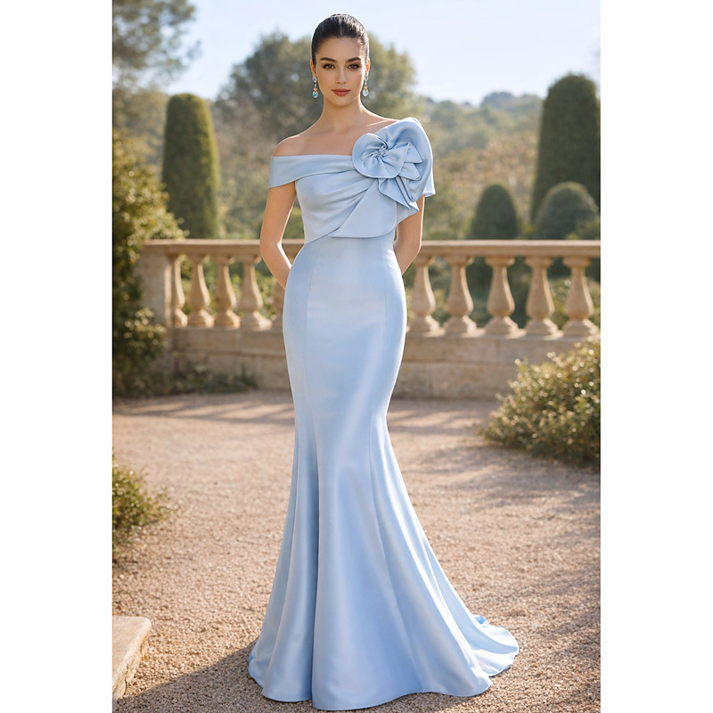 Mermaid Trumpet Floor Length Evening Gown Ball Gown Formal Dress Elegant Silky Short Sleeve Off Shoulder Wedding Formal Pocket Satin with Embroidered Flower