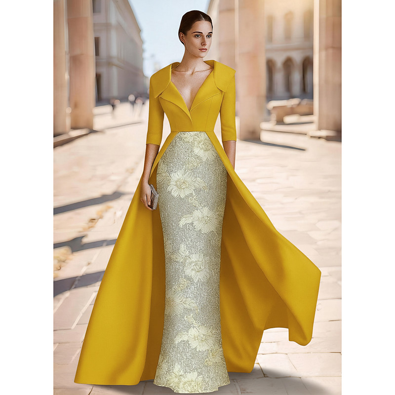 Sheath Column Floor Length Beaded Eembroidered Formal Dresses Mother of the Bride Dress Evening Gown Ball Gown with Overskirt Formal Dress Elegant Sparkle Silky 3/4 Length Sleeve Lapel Wedding Formal