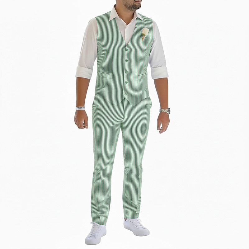 Men's Beach Wedding Groomsmen Seersucker Suits V Neck Yellow Pink Fashion Casual Striped Tailored Fit 2 Piece Single Breasted Five-buttons