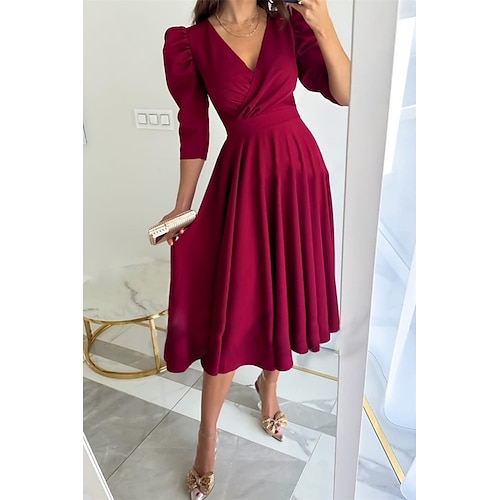 Damen Midikleid Wickelkleid A Linie Kleid Lässig Täglich Normale Passform Einfach Dreiviertelarm V Ausschnitt Schwarz Wein Rote Grün Frühling Herbst