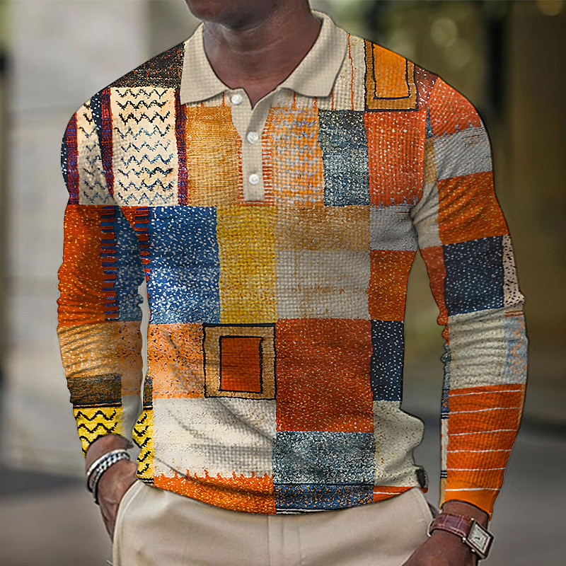 Men's Plaid Waffle Polo Shirts Golf Shirt Long Sleeve Polo Shirts Collared Shirts Vintage Casual Vacation Wear Formal Wear Festival Wear Buttons 3D Print Spring Fall Winter Orange