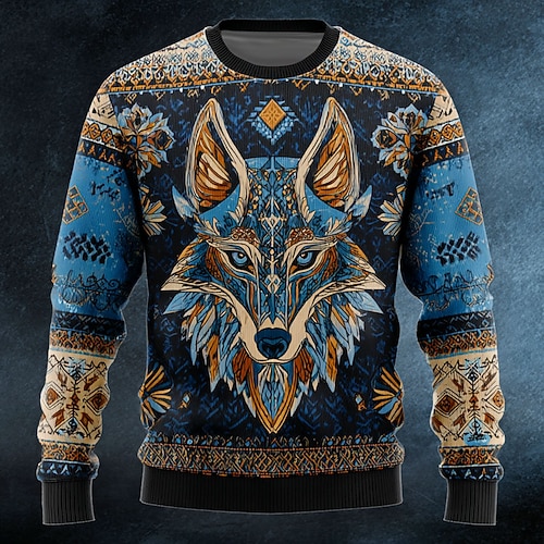 Per uomo Animale Lupo Vichingo Maglione Maglieria Girocollo Retrò Vintage Casual Vacanza Quotidiano Stampa 3D Lavoro a maglia Tenere al caldo Manica Lunga Primavera Autunno Inverno Blu Marrone Verde