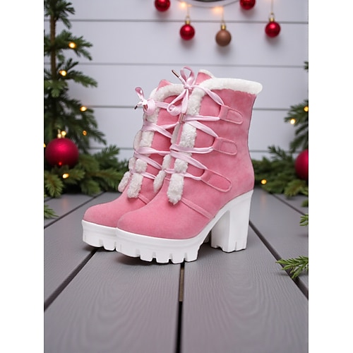 stivali invernali da donna in pelliccia sintetica rosa con lacci e tacco spesso - stivali alla moda caldi e antiscivolo per outfit natalizi e per la stagione fredda