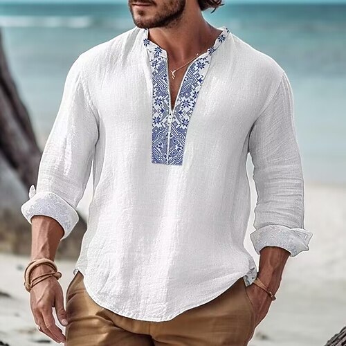 Per uomo Camicia Camicia di lino Camicia popover Camicia Estiva Abbigliamento da spiaggia Tinta unica Casuale Vacanza Blu Bianco Blu marino Verde Manica Lunga Colletto alla coreana Estate Primavera