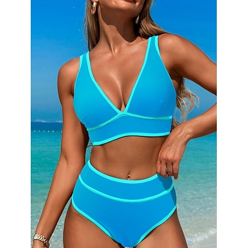 Costume da bagno due pezzi bikini da donna colorblock slanciato controllo della pancia vita alta slanciato senza schienale abbigliamento da spiaggia per le vacanze righe collo a V senza maniche