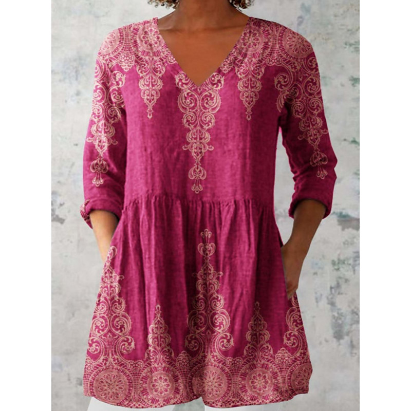 Women's Shirt Blouse Floral Bohemia Daily Retro Vintage Long Sleeve V Neck Regular Tops Daily Print Wine Fuchsia Green Summer Spring