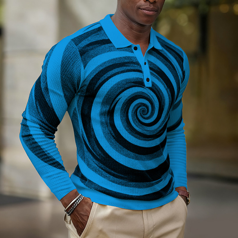Men's Geometic Spiral Waffle Polo Shirts Long Sleeve Polo Shirts Collared Shirts Casual Daily Wear Buttons Spring Fall Winter Blue White Purple