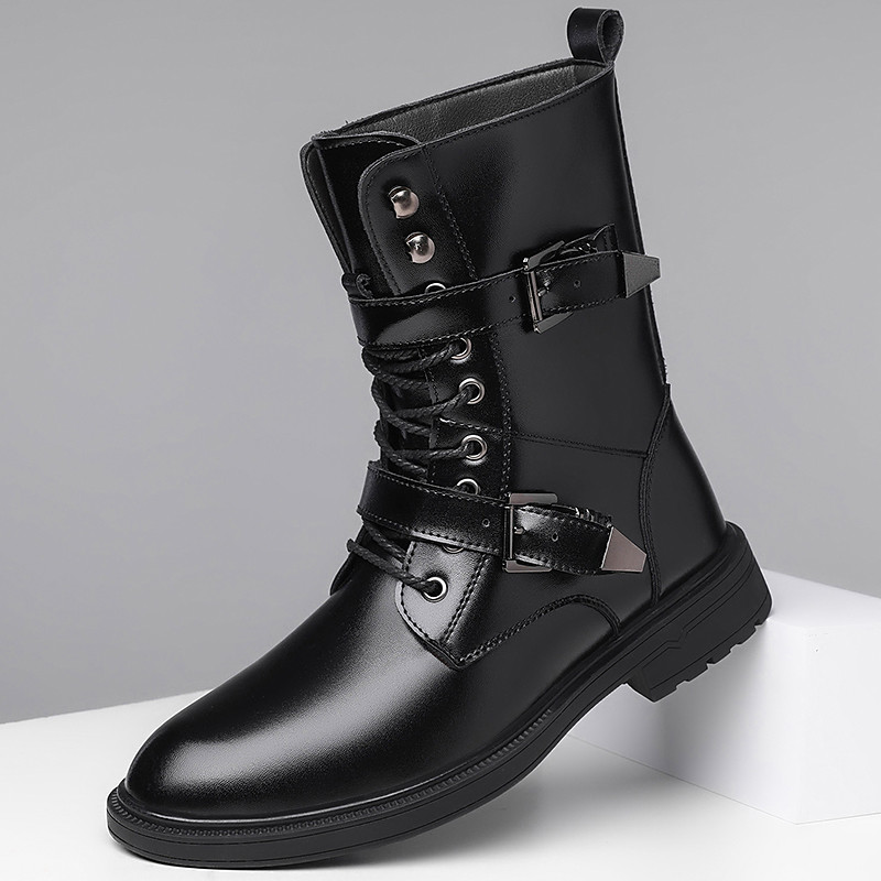 Black Faux Leather Men's Lace-Up Combat Boots with Rugged Sole, Chunky Design and Military Style – Perfect for Bikers, Punk Rock Fashion and Casual Outdoor Wear