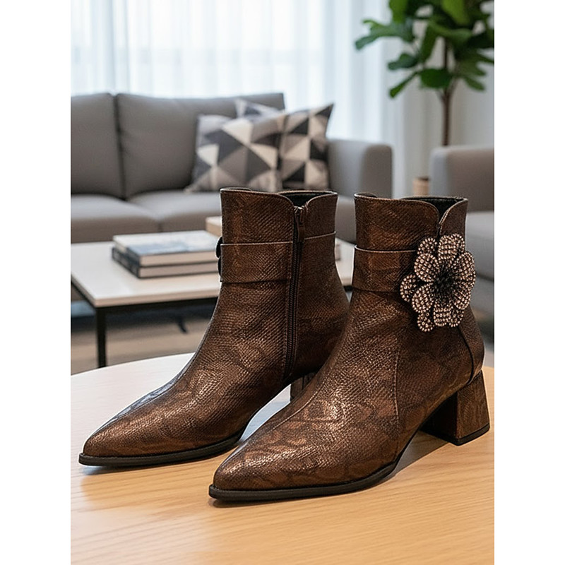 Women's Brown Snake Print Ankle Boots with Crystal Flower Decoration – Chic Block Heel, Pointed Toe, Trendy Casual Boots for Fall Winter and Daily Outing
