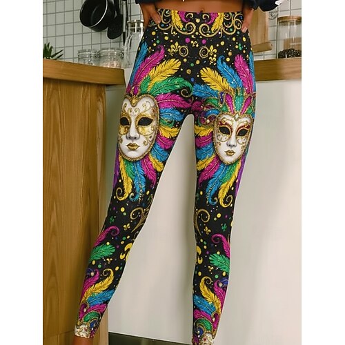 Karnevals-Leggings für Damen, bequeme Leggings im Vintage- und Ethno-Stil, lange Hose mit hohem Bund, Grafikprint, bequem, dehnbar, lässig, für Alltag und Urlaub, marineblau, schwarz, lila, Frühling,