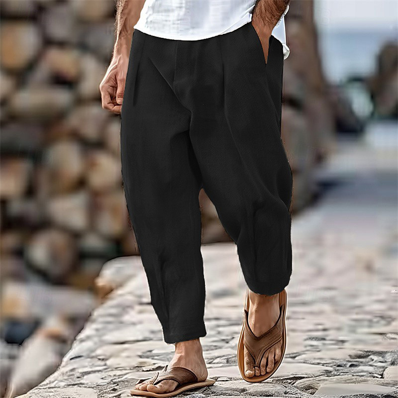 Men's Linen Pants Trousers Beach Pants Drawstring Pocket Elastic Waistband Plain Comfort Breathable Daily Stylish Hip Hop Light Khaki Black Micro-elastic