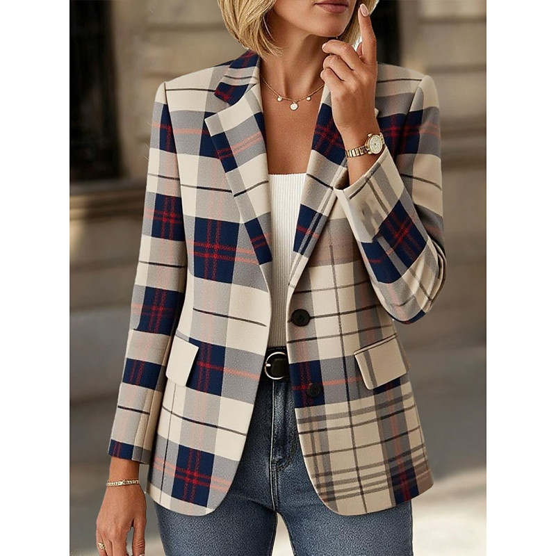 Women's Blazer Warm Comfortable Pocket Buttons Print Daily Casual Plaid Formal Office Casual Single Breasted Regular Notch Lapel Regular Fit Long Sleeve Outerwear Khaki Spring Fall