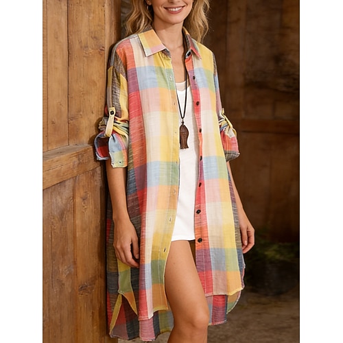 Per donna Camicia Blusa Finto cotone e lino Plaid Casual Manica Lunga Colletto a Camicia Top lunghi Ferie Uscire Bottoni Blu Nero Arancione Estate Primavera