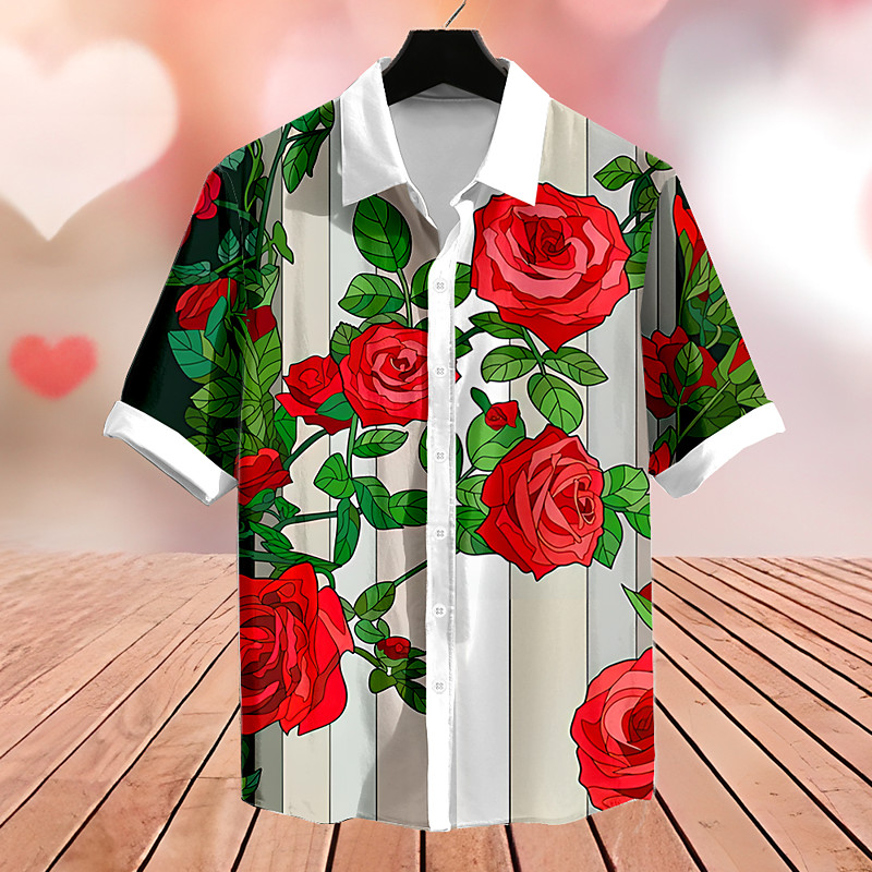 Valentine's Day Floral Rose Romantic Men's Resort Hawaiian 3D Printed Shirt Button Up Short Sleeve Summer Beach Vacation S TO 3XL