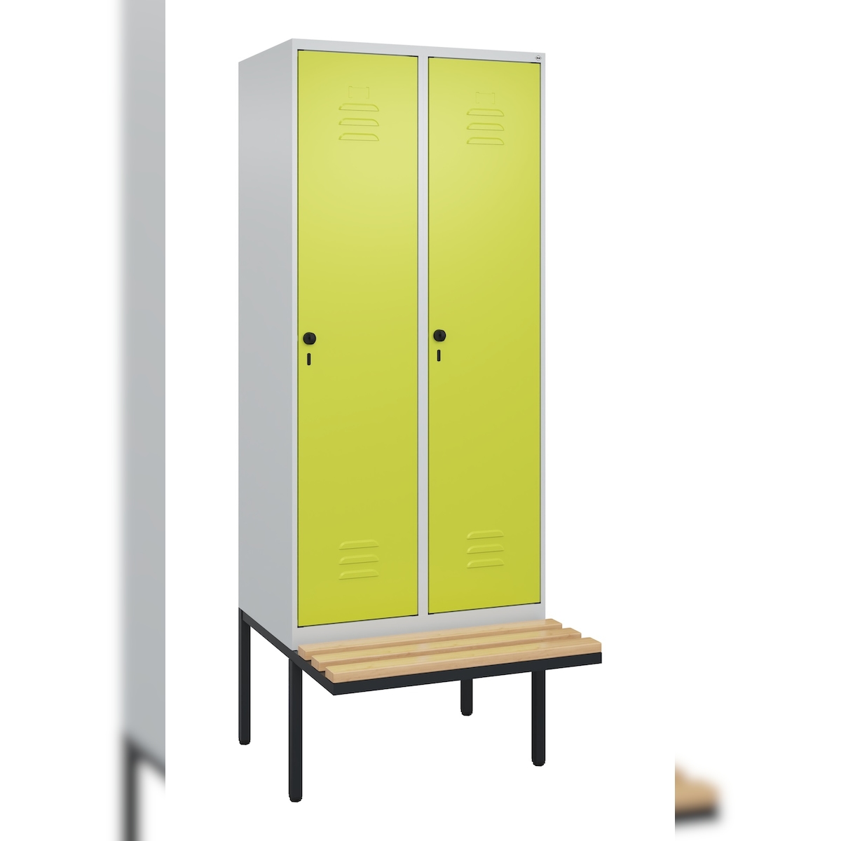 C+P Spind Classic PLUS, schwebender Sitzbank aus Buche 2 Abteile, HxBxT 212x80x82cm, Sicherheitsdrehriegel, Hellgrau/Clowngrün von PROREGAL