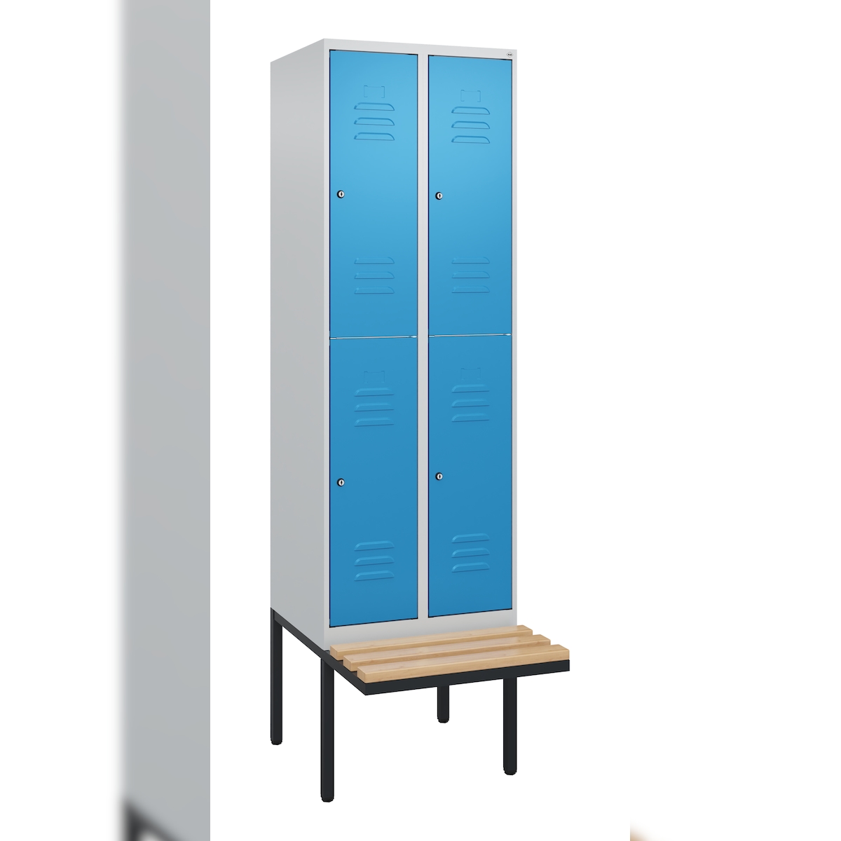 C+P Spind Classic PLUS, Buche schwebende Sitzbank, 4 Abteile, HxBxT 212x60x82cm, Zylinderschloss, Hellgrau/Lichtblau von PROREGAL
