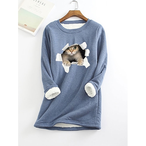 Damen Sweatshirt-Pyjama mit Fleecefutter Katze Warm Flauschig Langarm Rundhals Rundhalsausschnitt Lange Oberteile Lässig Sport Schwarz Gelb Rosa Dunkelpink Rote Herbst Winter