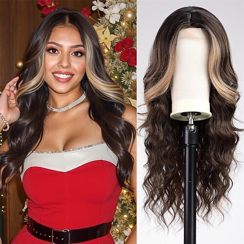 Lange, kastanienbraune, gewellte Perücken für Frauen, lockige Perücke mit Mittelscheitel, hitzebeständige Faserperücke für den täglichen Gebrauch