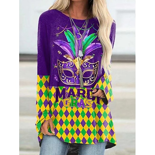 Karneval Damen T-Shirt Grafik Geometrie Vintage Stylisch Lässig Lange Ärmel Rundhalsausschnitt Regelmäßige Oberteile Täglicher Druck Lila Herbst Winter