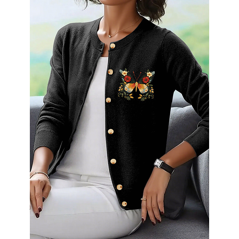 Women's Cardigan Elegant Vintage Daily Graphic Butterfly Ribbed Crew Neck Buttons Knitted Long Sleeve Regular Tops Knit Outdoor Home Work Black Red Spring Fall