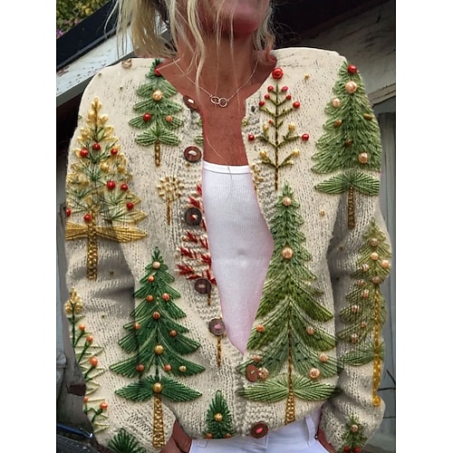 Weihnachts Cardigan für Damen Alltag Grafisch Baum Ribbed Rundhals Knöpfe Druck Langarm Reguläre Oberteile Strick Außen Feiertags Wochenende Grün Beige Herbst Winter