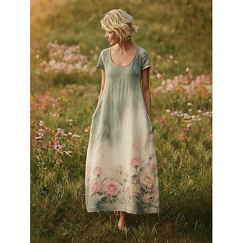 Per donna Abito lungo maxi Abito Boho Vestito Casual Vintage Quotidiano All'aperto Spiaggia Vestibilità comoda Floreale Manica Corta Collo a U Verde Estate Primavera