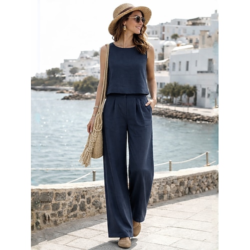 Per donna Set di Pantaloni Finto cotone e lino Senza Maniche Girocollo Semplice Elegante Moda Streetwear Casuale Quotidiano All'aperto Blu Nero Arancione Estate Vestibilità comoda