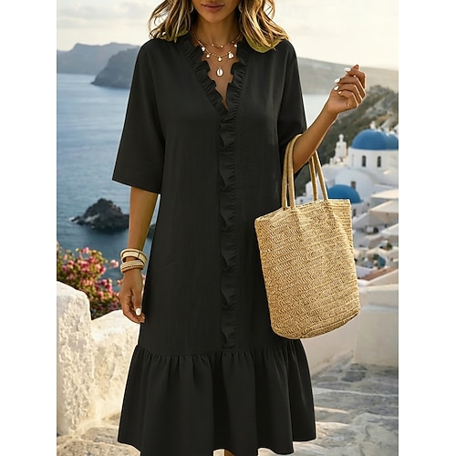 Per donna Abito al ginocchio Abiti di lino Abito in lino Essenziale Spiaggia Vacanza Vestibilità comoda Colore Puro Mezza Manica Scollo a V Nero Bianco Verde Estate