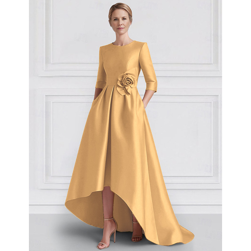 A-Line Asymmetrical Floor Length Evening Gown Ball Gown Formal Dress Elegant Silky Half Sleeve Crew Neck Wedding Formal Champagne Mother Of the Bride Dress Stretch Satin with Pocket