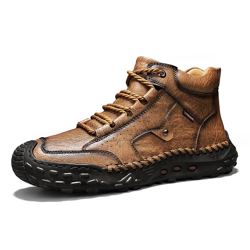 Men's Brown Faux Leather Outdoor Trail Boots with Durable Rubber Sole and Hand-Stitched Detailing, Comfortable Casual Work Boots for Hiking and Daily Wear