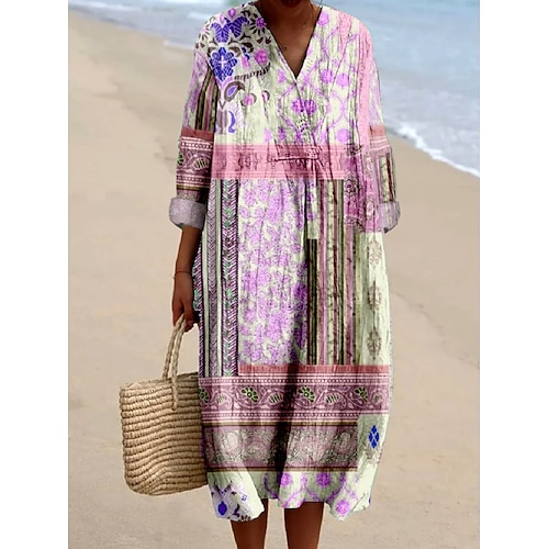 Per donna Abito Midi Vestito Estivo Abito a trapezio Vacanza Casual Boho Ferie Data Spiaggia Vestibilità comoda Floreale Grafico Paisley Manica Lunga Scollo a V Rosa chiaro Verde chiaro Viola chiaro