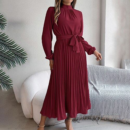 Abito midi da donna abito a linea casual quotidiano vestibilità regolare tinta unita maniche lunghe scollo a V nero rosso verde primavera autunno inverno