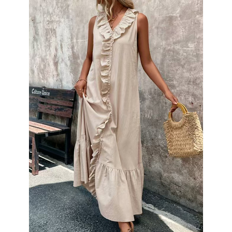 Women's Normal Casual Dress Cotton Linen Dress Hawaiian Casual Vacation Date Regular Fit Plain Sleeveless V Neck Khaki Summer