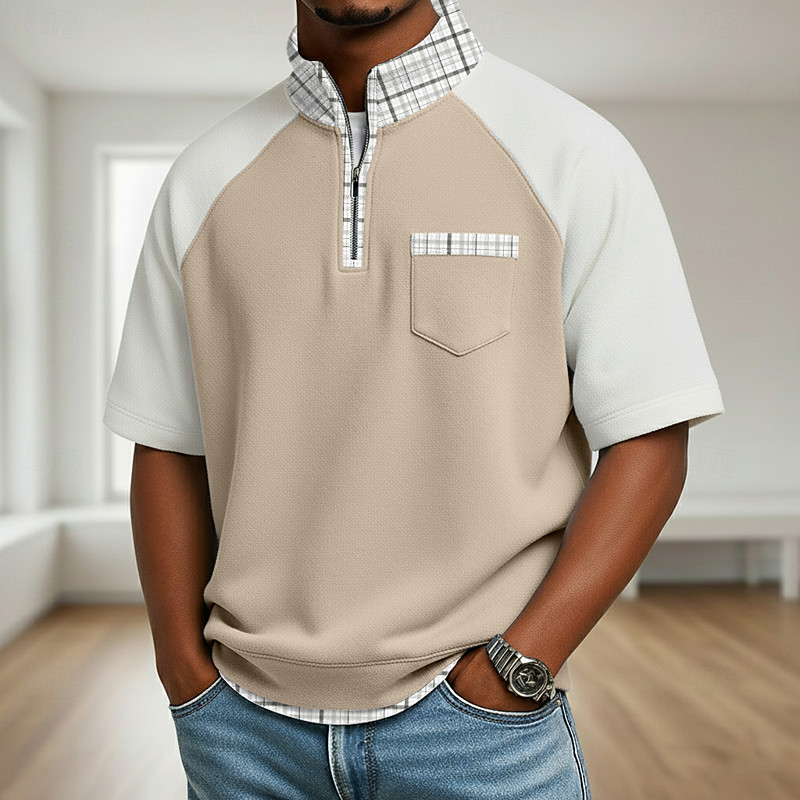Men's Polo Shirts Casual Holiday Quarter Zip Short Sleeve Basic Modern Plaid Color Block Buttons Summer Spring Regular Fit Light Green Navy Blue Khaki Light Blue Polo Shirts