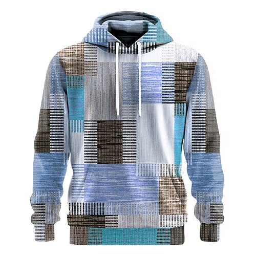 Men's Geometric Plaid Hoodie Sweatshirt Fashion Daily Crew Neck Home Streetwear Party Blue Brown Green Khaki Drawstring Fall Winter Designer S M L XL XXL XXXL