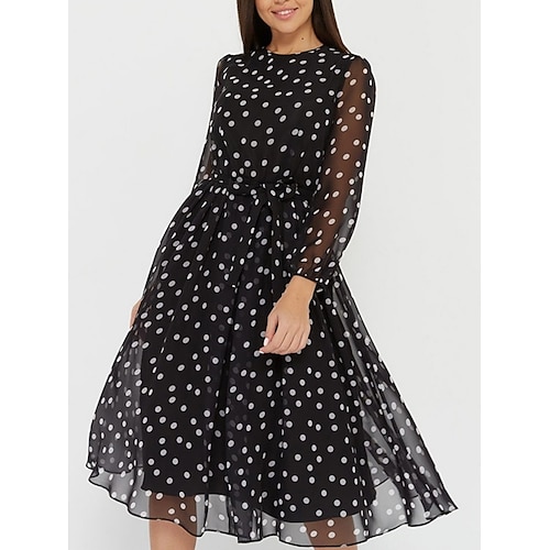Damen Midikleid A Linie Kleid Lässig Täglich Normale Passform Tupfen Langarm Rundhalsausschnitt Schwarz Rote Marineblau Grau Frühling Herbst