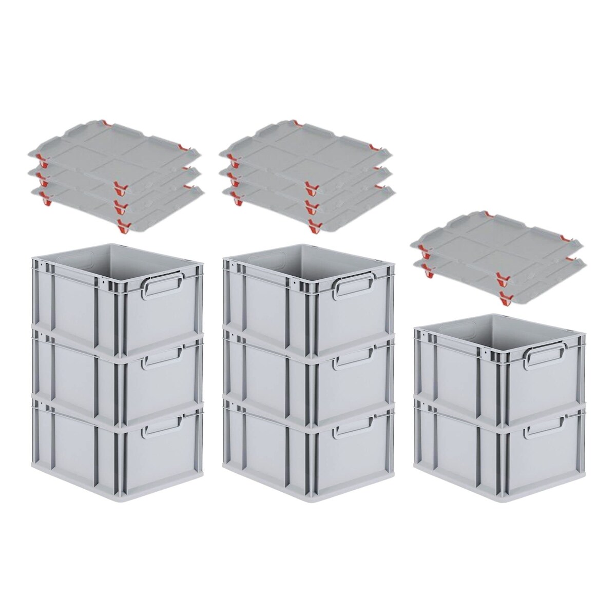 PROREGAL SuperSparSet 8x Eurobox NextGen Grip mit Auflagedeckel & 4 roten Verschlüssen, HxBxT 22x30x40cm, 20L, Grau, Griffe zu, Eurobehälter