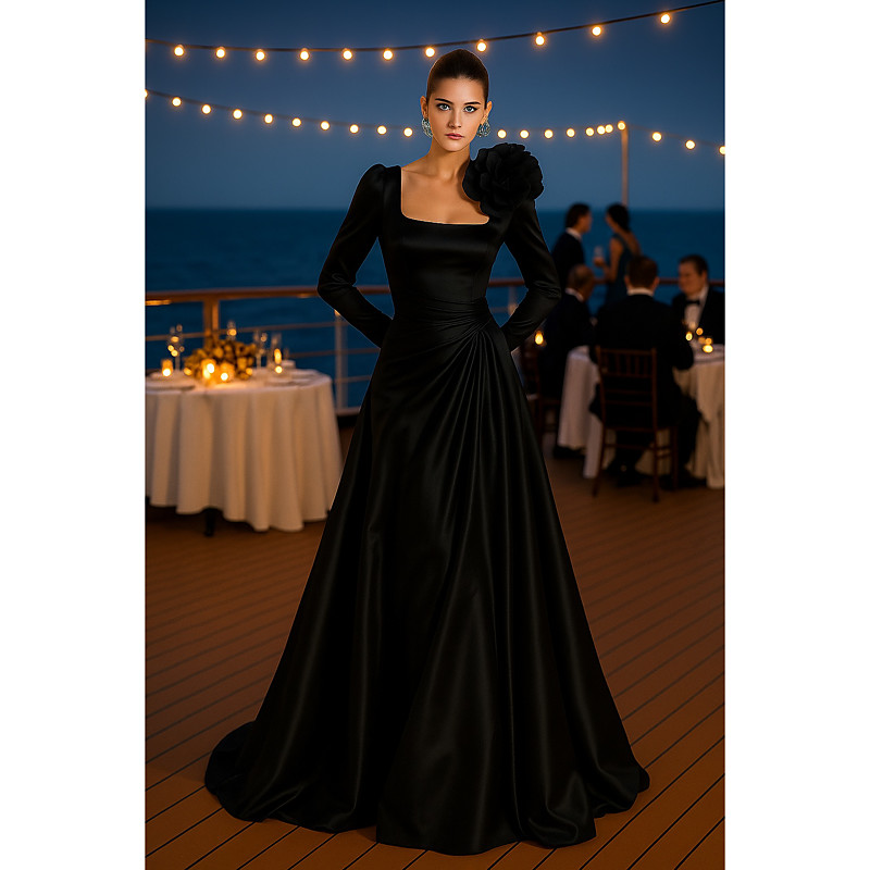 A-Line Floor Length Evening Gown Ball Gown Formal Dress Elegant Silky Long Sleeve Square Neck Wedding Formal Pocket Satin with Pleats Pocket Shouder Flower