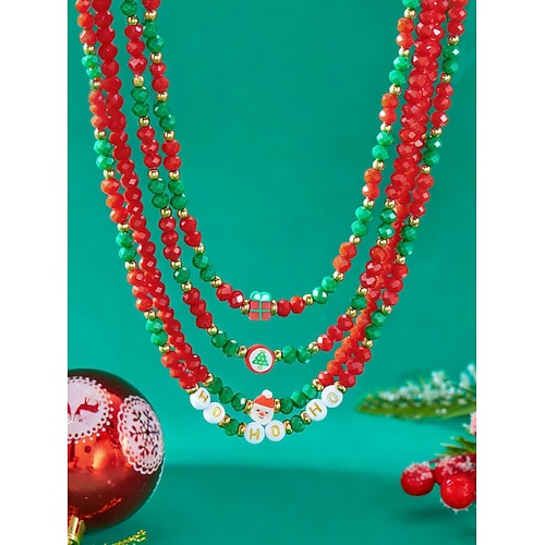 Weihnachtliches Perlenketten-Set für Damen – rote und grüne Perlen mit Anhängern von Weihnachtsmann, Schneemann und Baum, perfekt für Weihnachtsfeiern und festliche Anlässe.