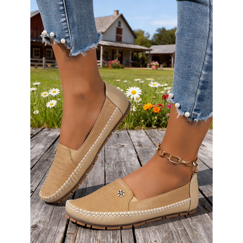 Women's Camel Perforated Slip-On Flats with Leather and Beige Contrast – Comfortable Summer Casual Shoes for Outdoor Activities, Travel and Everyday Wear