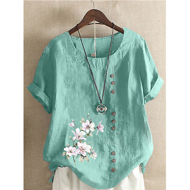 Women's Blouse Cotton Linen Shirts Flower Casual Short Sleeve Crew Neck Regular Tops Daily Holiday Print White Yellow Army Green Green Summer