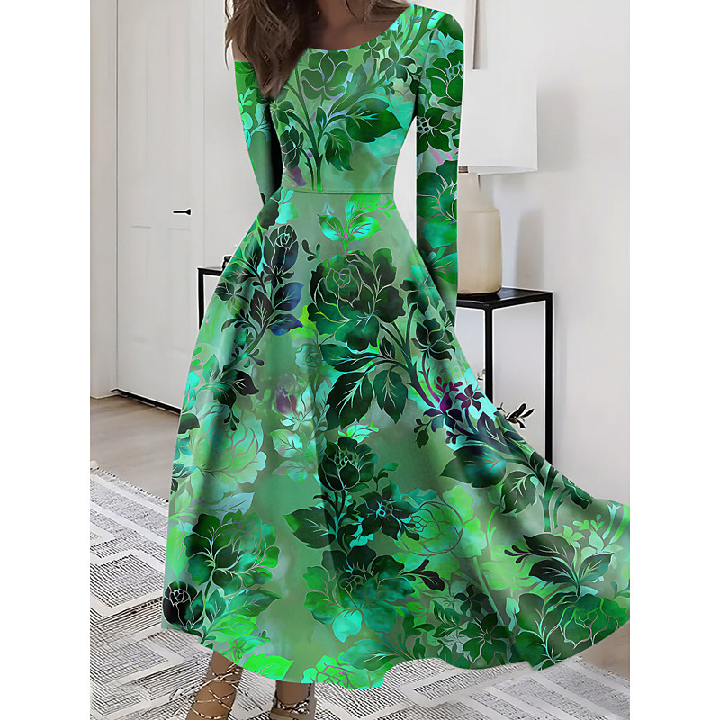 Women's Midi Dress A Line Dress Fit And Flare Dress Vacation Casual Boho Party Daily Going out Regular Fit Floral Graphic Long Sleeve Crew Neck Blue Red Purple Green Summer Spring Fall Winter