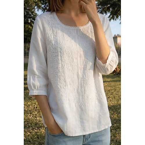Per donna Maglietta Finto cotone e lino Ricamato Floreale Moda Etnico Casual Mezza Manica Girocollo Top Regolari Uscire Abbigliamento da vacanza Verde acqua Bianco Giallo Viola Cachi Estate Primavera