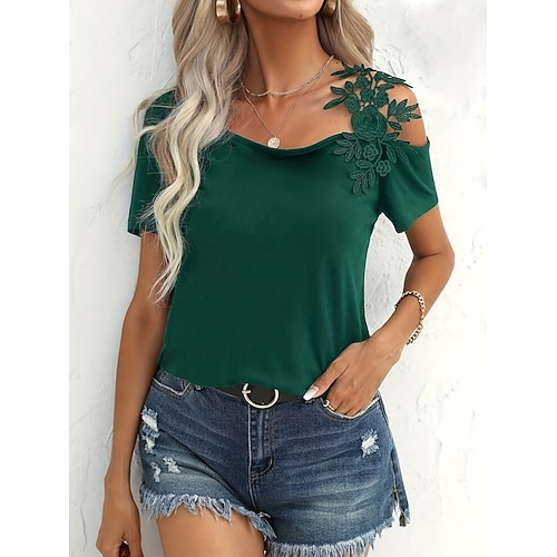 Per donna Maglietta Semplice Moda Elegante Classico Manica Corta Scollo a V Top Regolari Quotidiano Weekend Pizzo Patchwork Nero Bianco Marrone Verde Estate Primavera