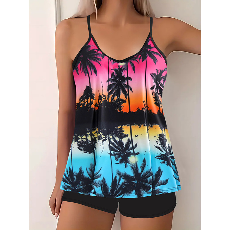 Women's Tankini 2 Piece Swimsuit Palm Boy Leg Tummy Control High Waist Slim Backless Vacation Beach Wear Floral Sunflower V Neck Sleeveless Bathing Suits