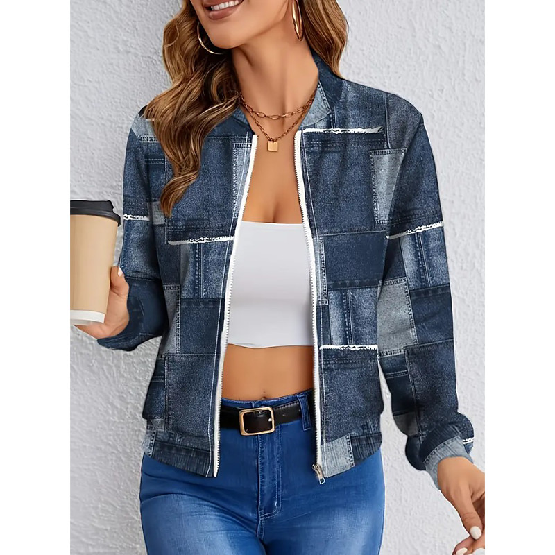 Women's Casual Jacket Warm Quick Dry Zipper Pocket Elegant Fashion Daily Simple Floral Vacation Casual Daily Holiday Regular Baseball Collar Regular Fit Long Sleeve Outerwear Black And White Blue