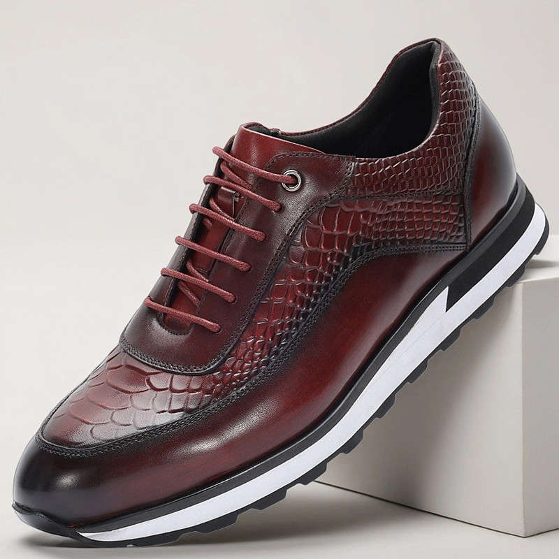 Men's Burgundy Genuine Leather Crocodile Embossed Sneakers with Round Toe and Contrast Stitching, Elegant Luxury Shoes for Parties and Business Events