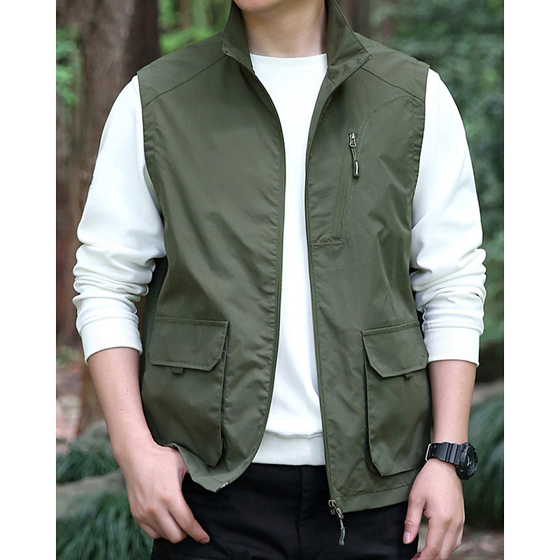 Men's Vest Gilet Outdoor Daily Fashion Casual Spring Fall Pocket Polyester Comfortable Breathable Plain Zipper Stand Collar Regular Fit Black Khaki Army Green Dark Blue Vest