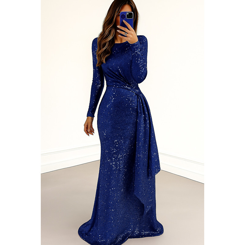 Sheath Column Floor Length Prom Dresses Evening Gown Ball Gown Formal Dress Elegant Sparkle Long Sleeve Crew Neck Wedding Formal Sequined with Glitter Pleats