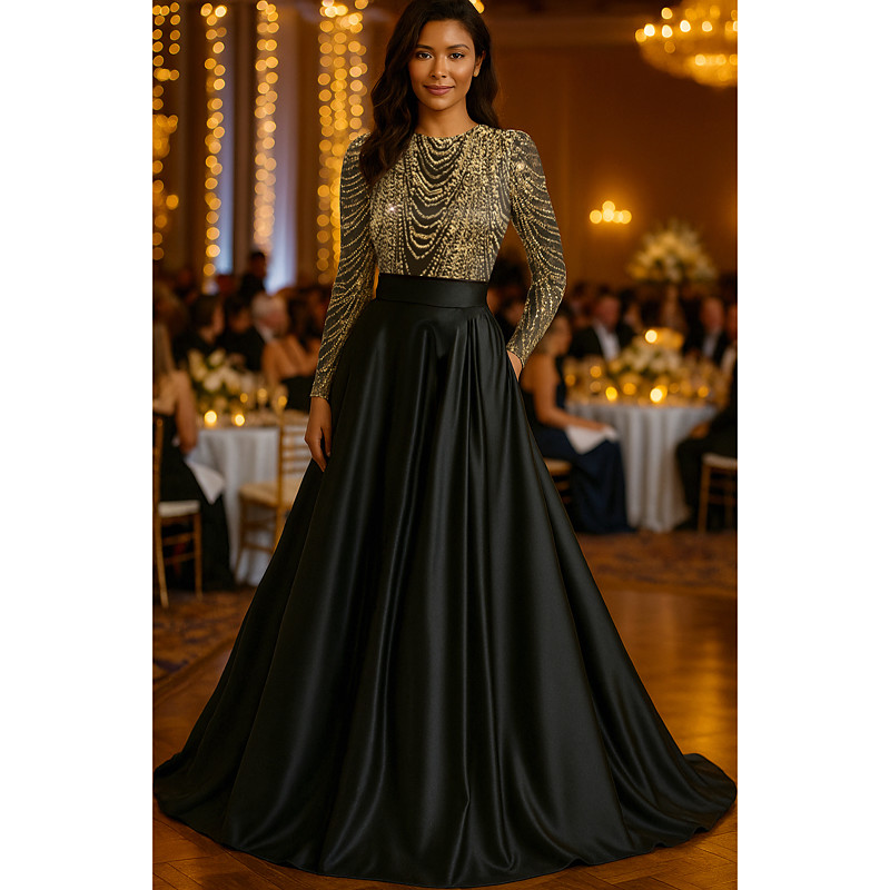 A-Line Floor Length Beaded Eembroidered Formal Dresses Mother of the Bride Dress Evening Gown Ball Gown Formal Dress Elegant Vintage Glittering Long Sleeve Crew Neck Wedding Formal Satin Sequined with
